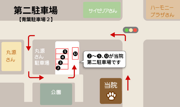大網街道、ハーモニープラザ交差点を東へ60m。駐車場は、病院横に3台、近隣に専用駐車場5台(地図参照)のスペースがあります。駐輪場あり
